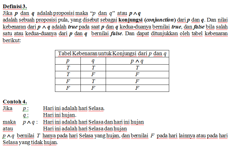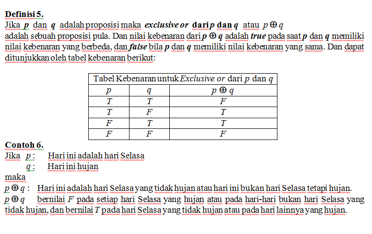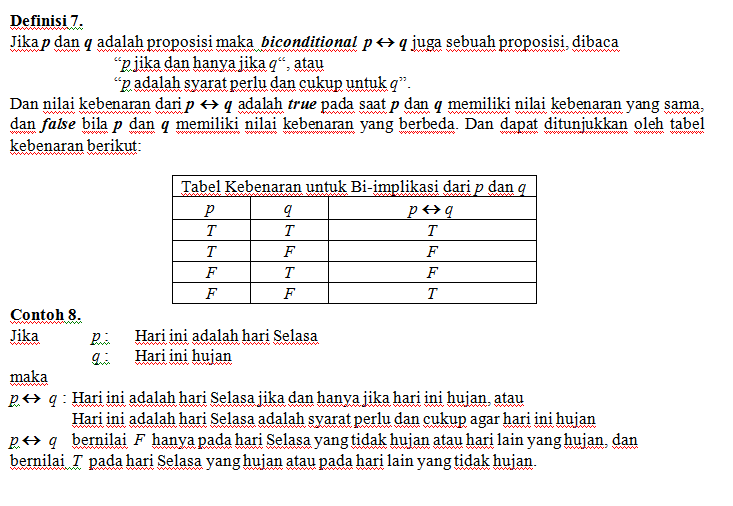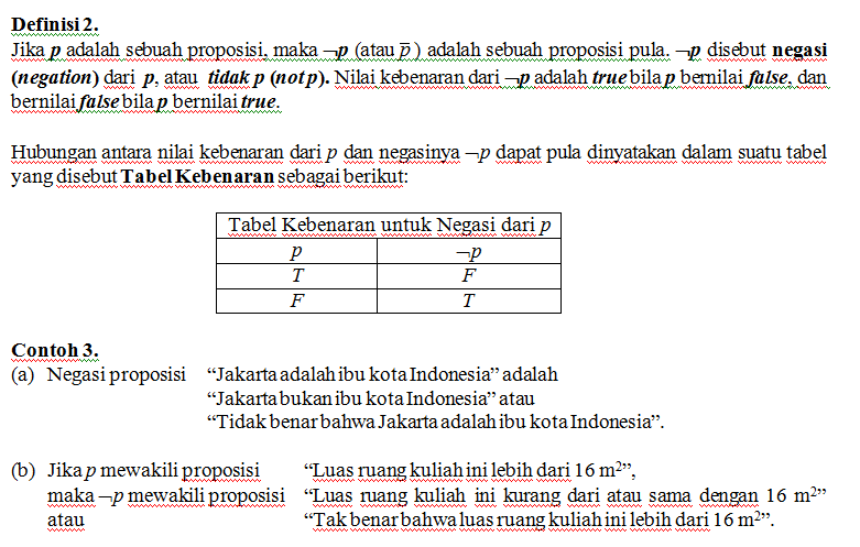 Suatu proposisi (proposition) adalah suatu pernyataan (statement) yang memiliki nilai kebenaran true (benar, T) atau false (salah, F) tetapi tidak kedua-duanya pada saat dinyatakannya.