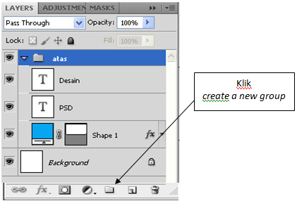 Agar layer-layer lebih tersruktur, kita buat group layer-layer tombol yang telah kita buat, dengan klik create a new group, lalu isikan nama grup ini dengan “atas”, sehingga akan mempermudah dalam pembuatan tombol rellovernya.